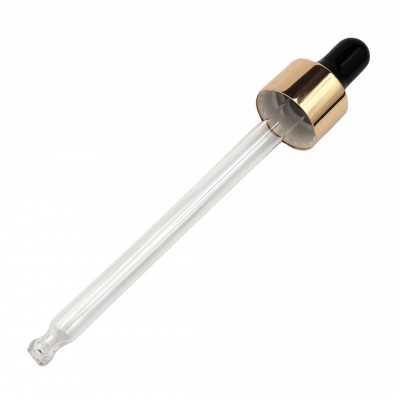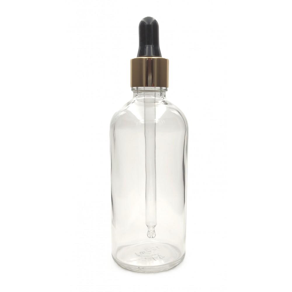 Buteleczka szklana o pojemności 100ml z pipetką szklaną i nakrętką w kolorze złoto-czarnym.